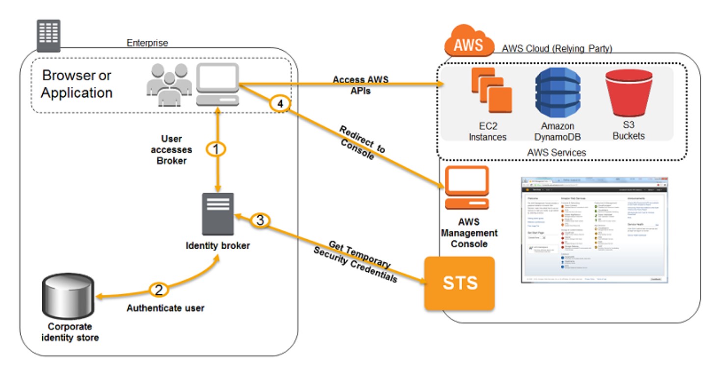 The identity broker application has permissions to access IAM’s token service (STS) API to create temporary security credentials.