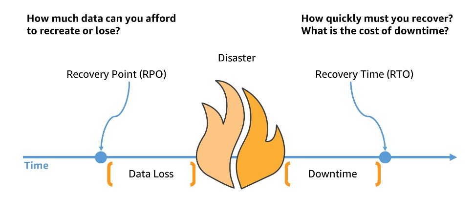 - Data loss is measured from most recent backup to the point of disaster. Downtime is measured from the point of disaster until fully recovered and available for service.