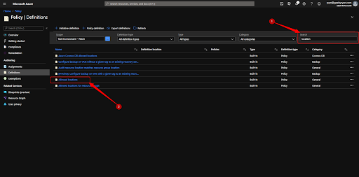 Click on “Definitions”. Here you will find several built-in definitions that can be applied to your resources. Definitions are a json template containing the logic for what you want to accomplish. It is worth investing some time to look through these built-in definitions.